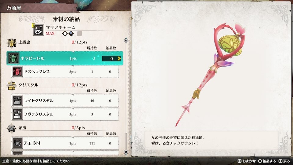 素材自体は序盤で簡単に集まるため、ネックになるのは「マギアチャームの書」を知っているかどうかだけです。「マギアチャームの書」を所持していないと加工屋にもラインナップされないので注意!