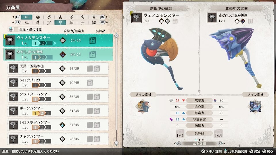 あかしまの神槌は、当ブログでも何度も紹介している序盤で作成できるハンマーヴェノムモンスターのほぼ上位互換と言える性能を持っています。