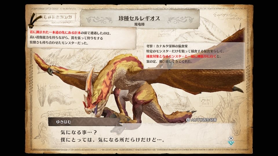 クエストでは珍種セルレギオスの調査を行い、アオアシラを連れて縄張りへ行くことで戦闘が発生します。