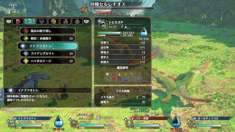 わたしの場合はアオアシラのLvが3だったため、雷属性攻撃ができるトビカガチを使って火力で押し切りました。