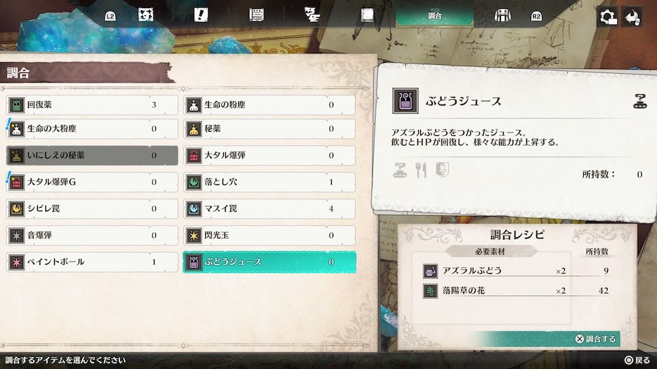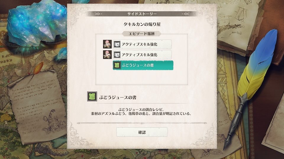 報酬としてぶどうジュースの調合レシピを入手できます。ぶどうジュースは