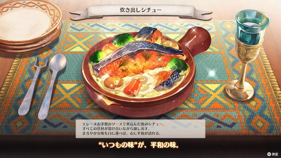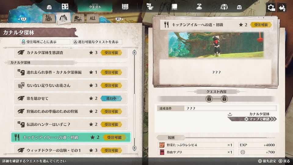 クエストクリアで「野菜たっぷりレシピ4」を入手。このレシピで作れる旬をひとくちカナッペの効果が超重要です。