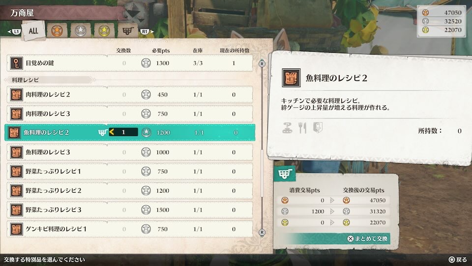 - 万商屋で「魚料理のレシピ2」と交換(※重要)