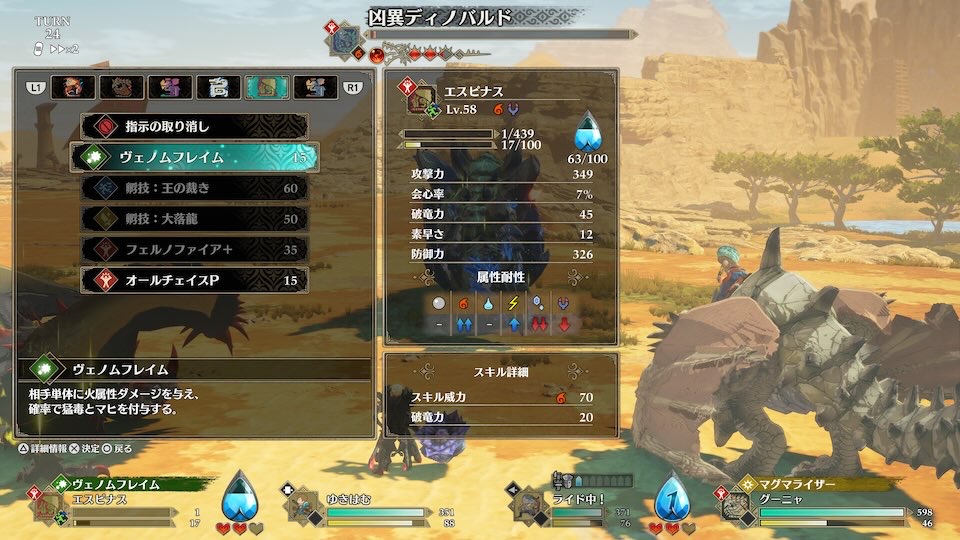 おすすめはオトモンはエスピナスです。使用スキルヴェノムフレイムは火属性ダメージ+猛毒+マヒ付与することができます。凶異ディノバルドは毒耐性ありますがそれでも猛毒にはかかりだいぶHPを削ってくれました。