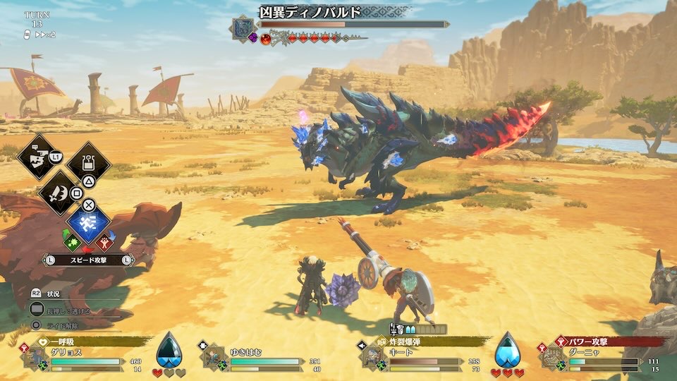 真っ向勝負で勝つことで被ダメージを抑えられます。凶異ディノバルドは攻撃力が高いので3すくみの攻防では必ず有利な攻撃をすることを意識してください。