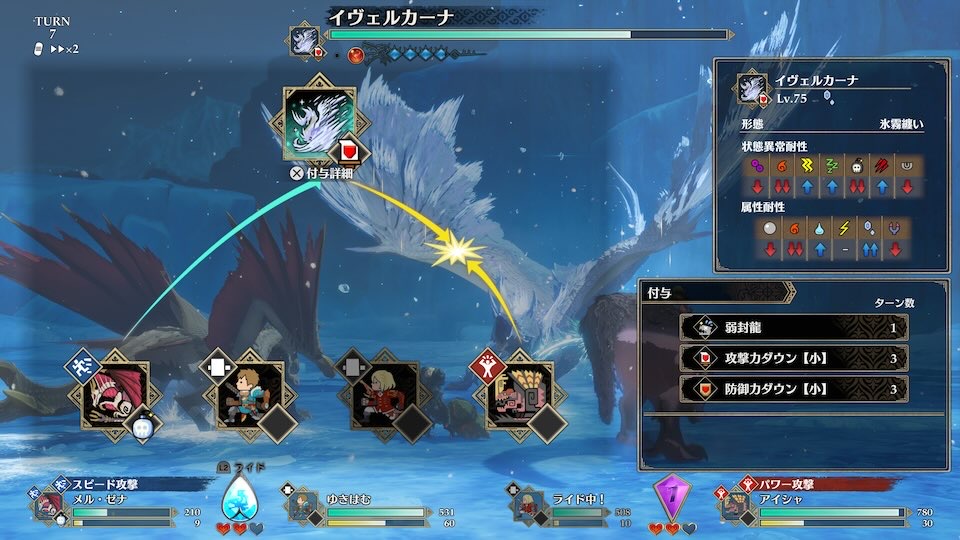 一度ライドすれば、「攻撃しながら毎ターン回復」という状態になり、安定感が段違いです。イヴェルカーナの弱点属性にもバッチリハマっているので高速周回したいとかではなければ回復型メルゼナが安全に攻略できました。