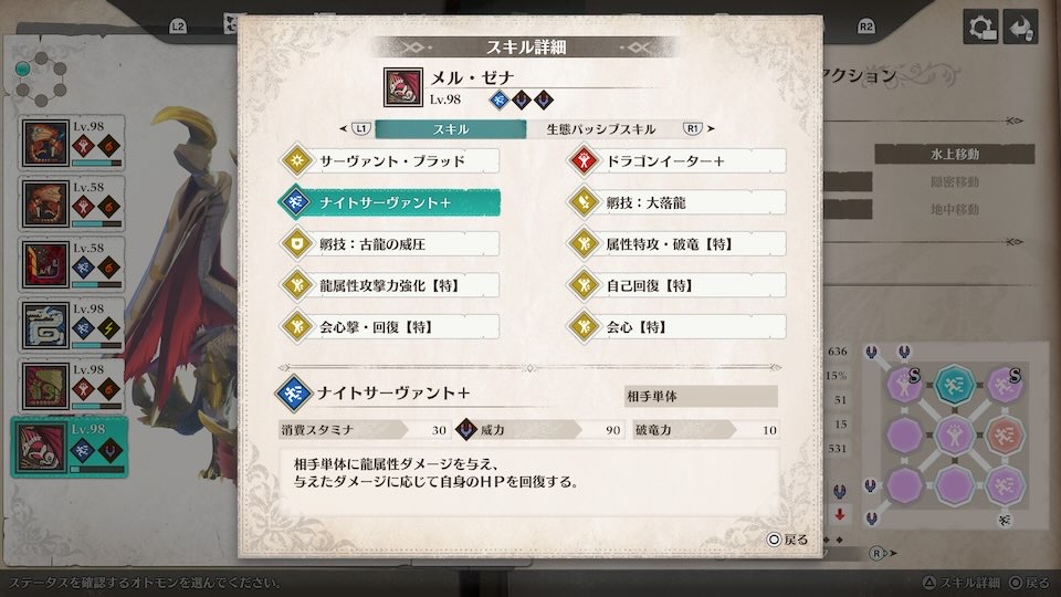 相手単体に龍属性ダメージを与え、与えたダメージに応じて自身のHPを回復。