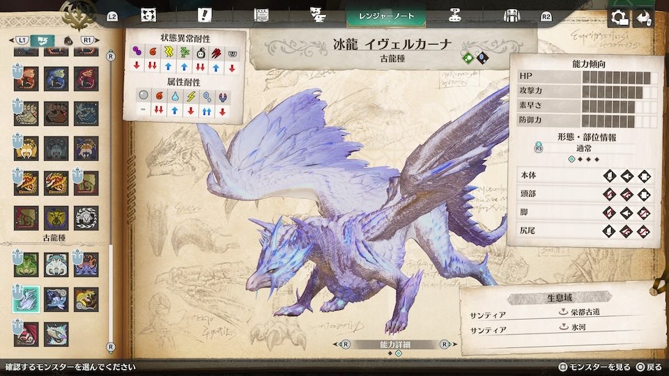 イヴェルカーナとの戦闘中に確認できた行動パターンです。イヴェルカーナは4つの形態を持つのが特徴です。特に「氷纏い」と「氷霧纏い」は見分けづらいため、戦闘中にR2でモンスターのステータスを確認してください。