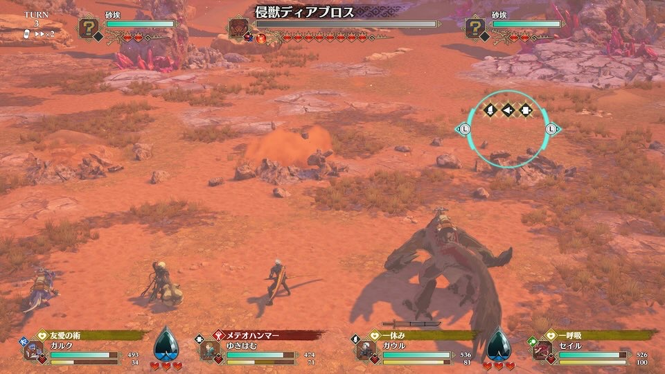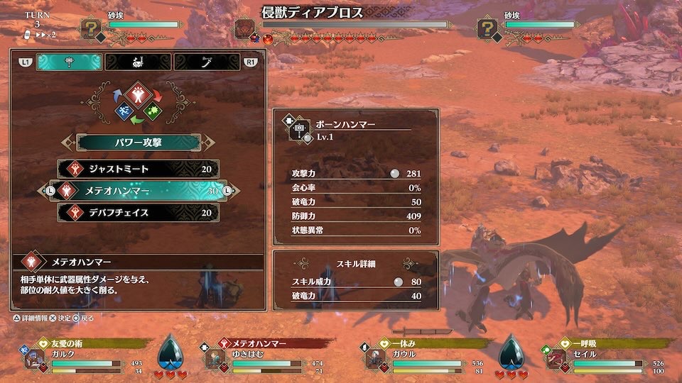 3ターン目に必ず右側の穴から侵獣ディアブロスが出てきます。メテオハンマーを当てる事で帰巣成功です。