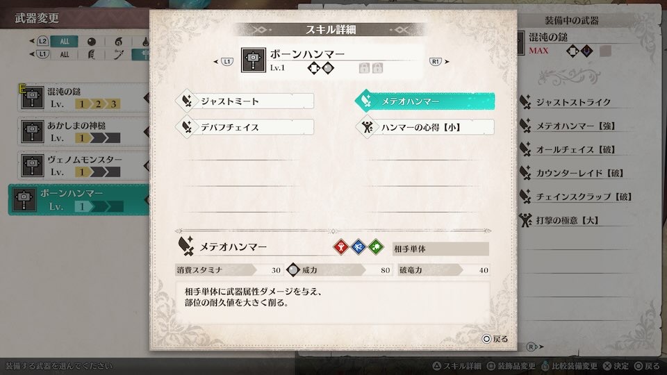 帰巣させるためには、ハンマーのスキル「メテオハンマー」が必須になります。ですが初期武器「ボーンハンマー」で大丈夫なので武器の強化や厳選は不要となります。