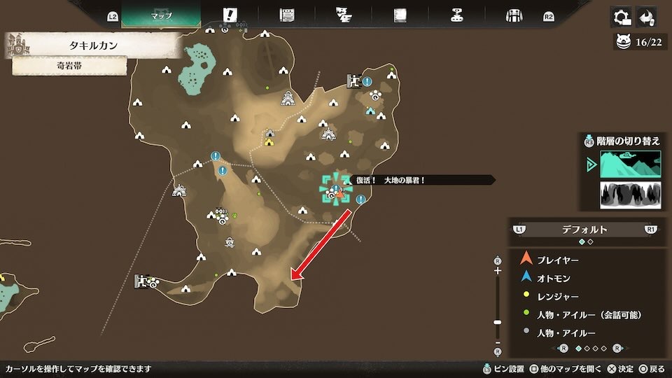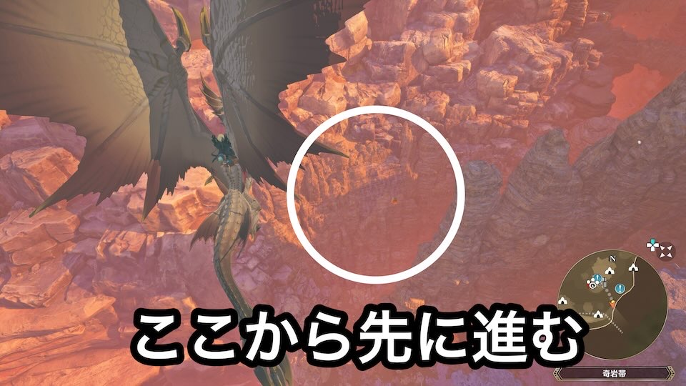 侵獣ディアブロスは、タキルカン・巨龍の骸の南側(夜限定)に出現します。ただし注意点として、巨龍の骸からは崖で直接行けないため、奇岩帯から回り込んで奥へ進む必要があります。