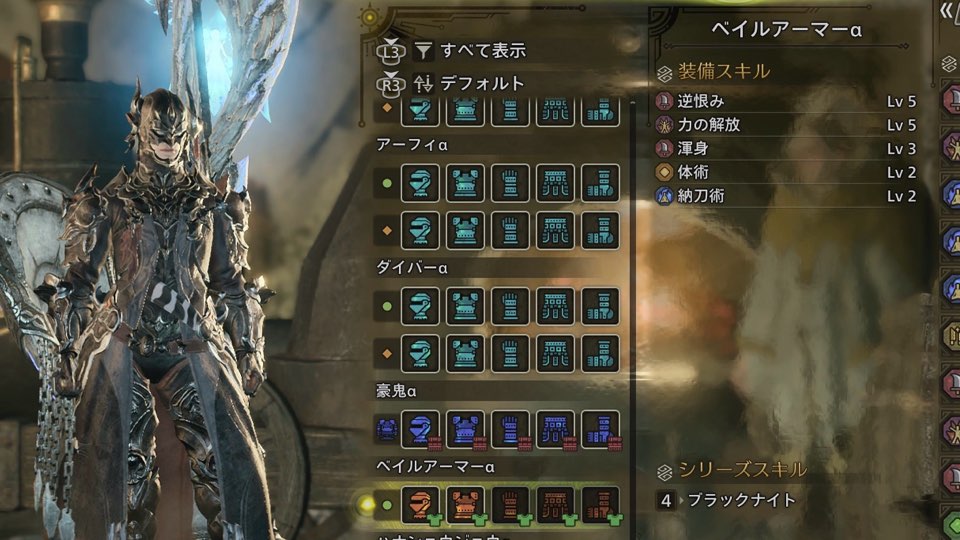 4部位装備すると、特殊アクション「ブラックナイト」がアイテムスライダーから使用可能。