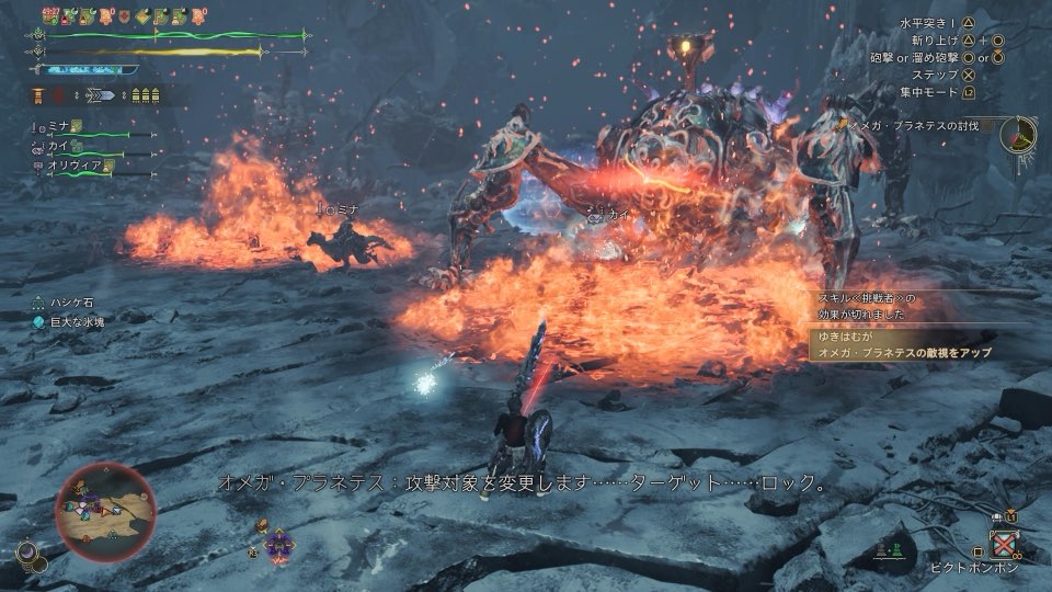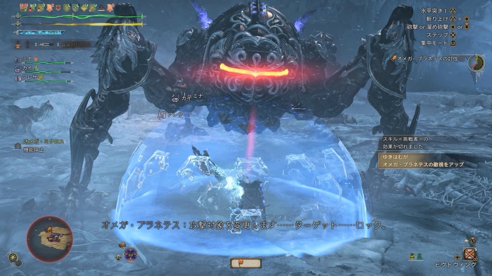 オメガ・プラネテスの敵視を取るためには頭部を一定ダメージ以上攻撃をしたプレイヤーに敵視が付きます。敵視を取れた時は画面右側に「敵視をアップ」の表記が出てプレイヤーとオメガに赤い線が出てきます。