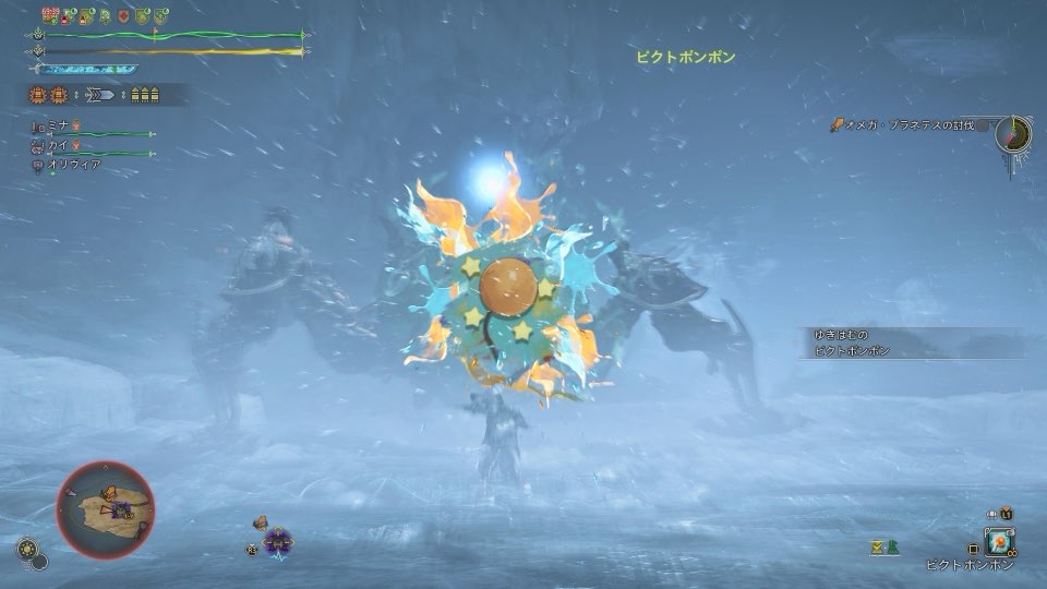攻撃前に画面右側にオメガ・プラネテスは「マスタードボム」の構えと表記が出てきます。その後にターゲットに向けて波状の着地点が表示されるので、これを確認したら急いで離れた場所へ「マスタードボム」を着弾させるようにしましょう。