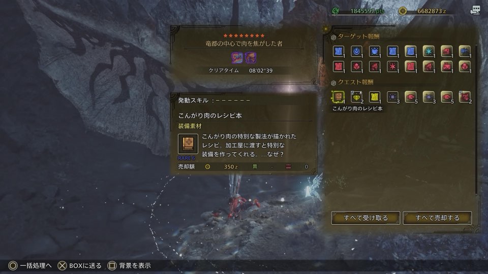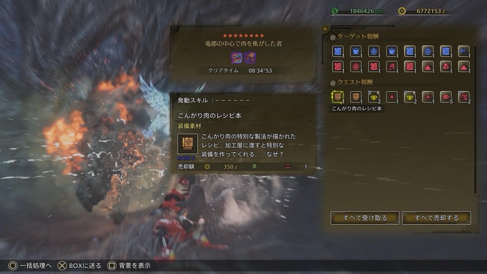 クリア報酬でイベント装備を作成するのに必要なチケット「こんがり肉のレシピ本」が入手できます。クエストを3回クリアしました1枚が2回、2枚が1回確認できました。
