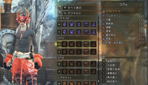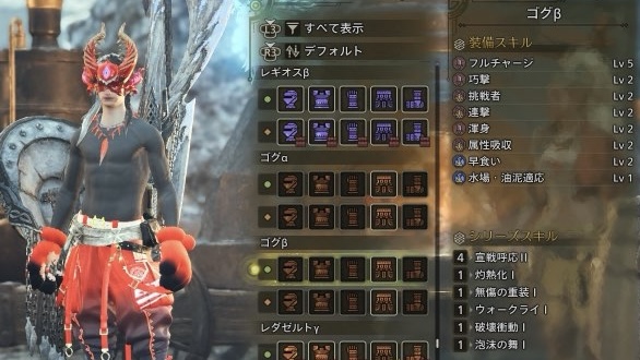 ゴグマジオスの装備は他のモンスター装備と違いαとβで発動スキル、空きスロットの数が同じになります。違いがあるのは発動されるシリーズスキルです。ゴグマジオス専用のシリーズスキルはどの防具でも発動されますが2つ目のシリーズスキルがこれまで登場して来たモンスター固有のシリーズスキルを1部位発動できます。