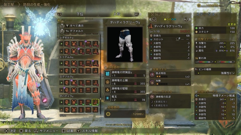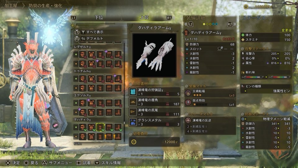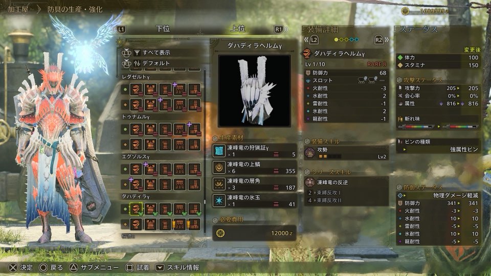 歴戦王ジン・ダハド討伐後にクリア報酬として「凍峰竜の狩猟証γ」が1枚以上手に入ります。1部位作成に「凍峰竜の狩猟証γ」が1枚必要になります。