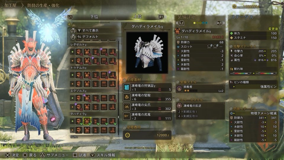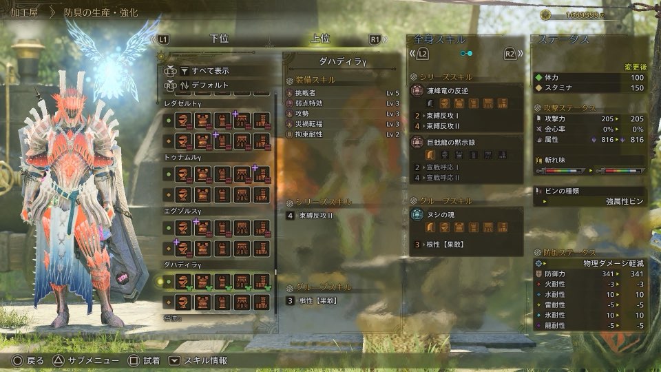 一式装備で発動されるスキルはどれも汎用性が高い強力なスキルが多いのが特徴です。なかでもどの武器でも基本発動させる事が多い挑戦者が2部位装備でLv5発動する事ができます。