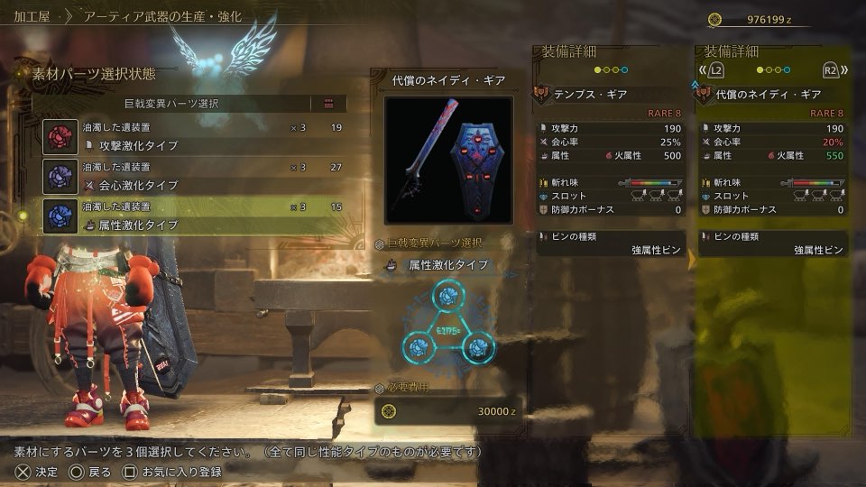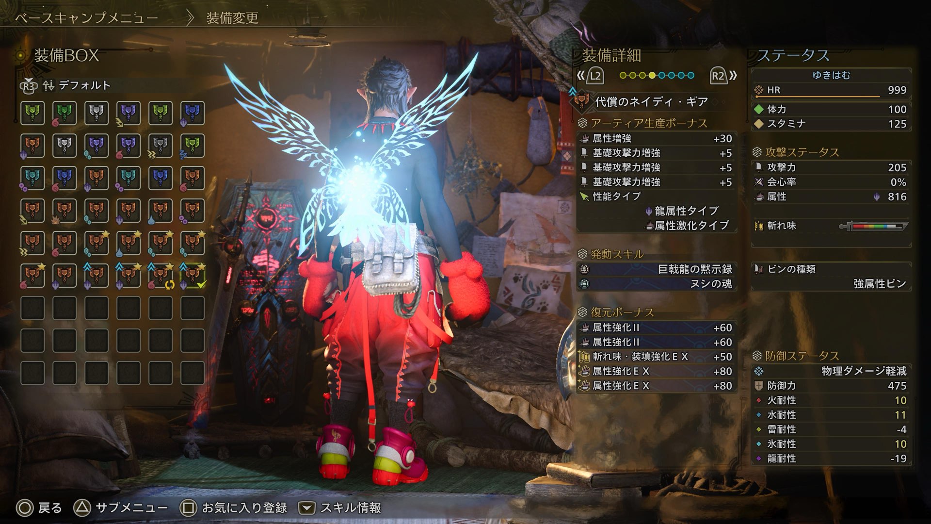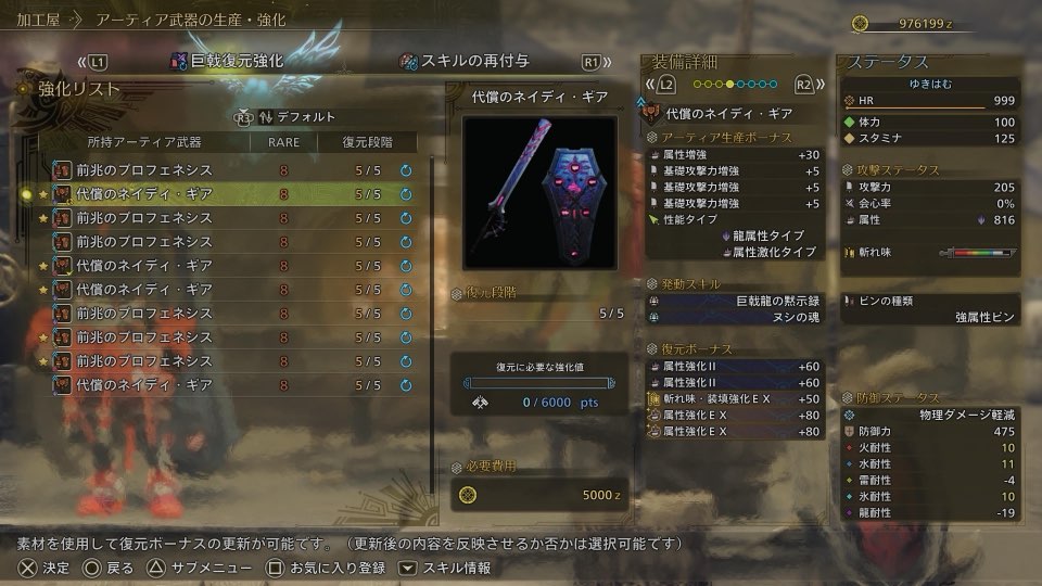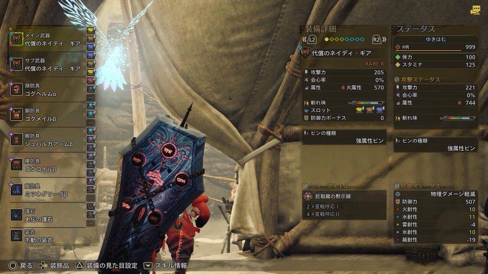 武器は火属性、龍属性ともに巨戟アーティア武器「代償のネイディア・ギア」になります。