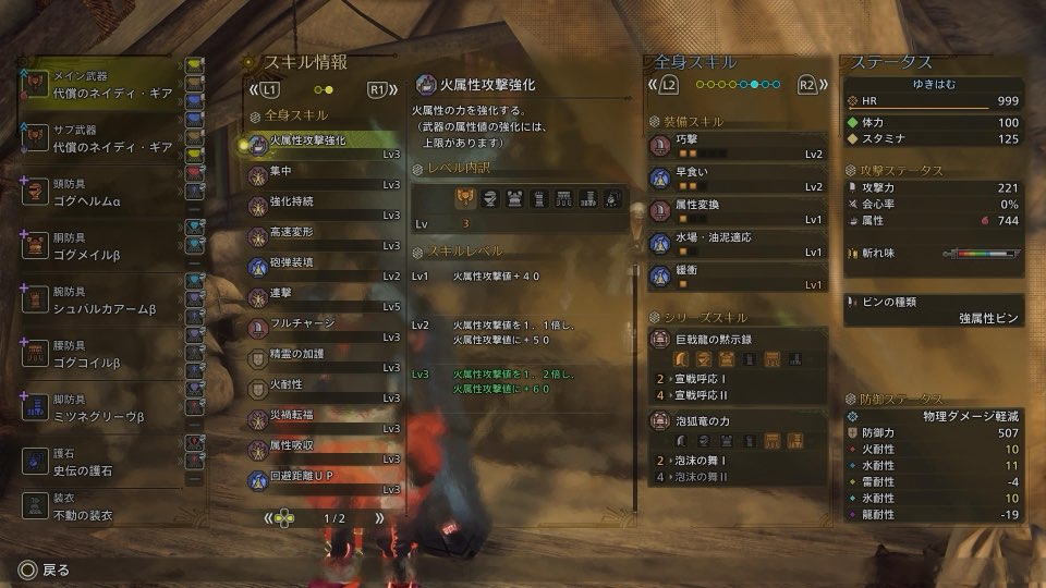 属性吸収Lv3は護石のスキルでLv3になっていますが装備スキルのみだとLv2になります。属性吸収は装飾品がないですがLv2でも全然大丈夫です!